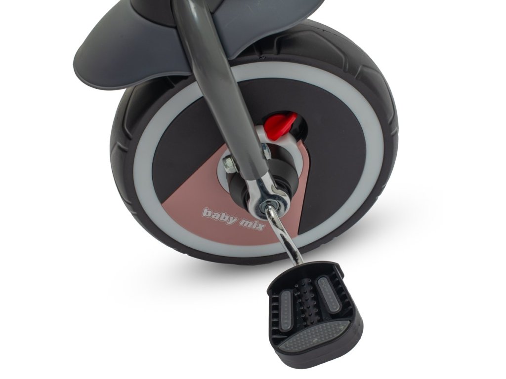 Dětská šlapací tříkolka Baby Mix 5v1 RELAX 365 je multifunkční dopravní prostředek a je typickým příkladem produktů GROW UP – roste zároveň s dítětem. Tříkolku může ovládat jak dítě, tak i rodič pomocí nastavitelné vodicí tyče. Po odebrání vodicí tyče, sklápěcí stříšky, která chrání před sluncem, nebo ostatních komponent bude sloužit jako tříkolka. Má moderní konstrukci, pohodlné a ergonomicky tvarované sedadlo, které je posuvné a otočné o 360 stupňů, což umožní dítěti cestovat ve směru nebo proti směru jízdy. Je vyrobena z kvalitních a odolných materiálů a skládací konstrukce umožňuje bezproblémovou přepravu tříkolky například v kufru auta. Její skládání je velmi jednoduché, intuitivní a nevyžaduje žádné nářadí.