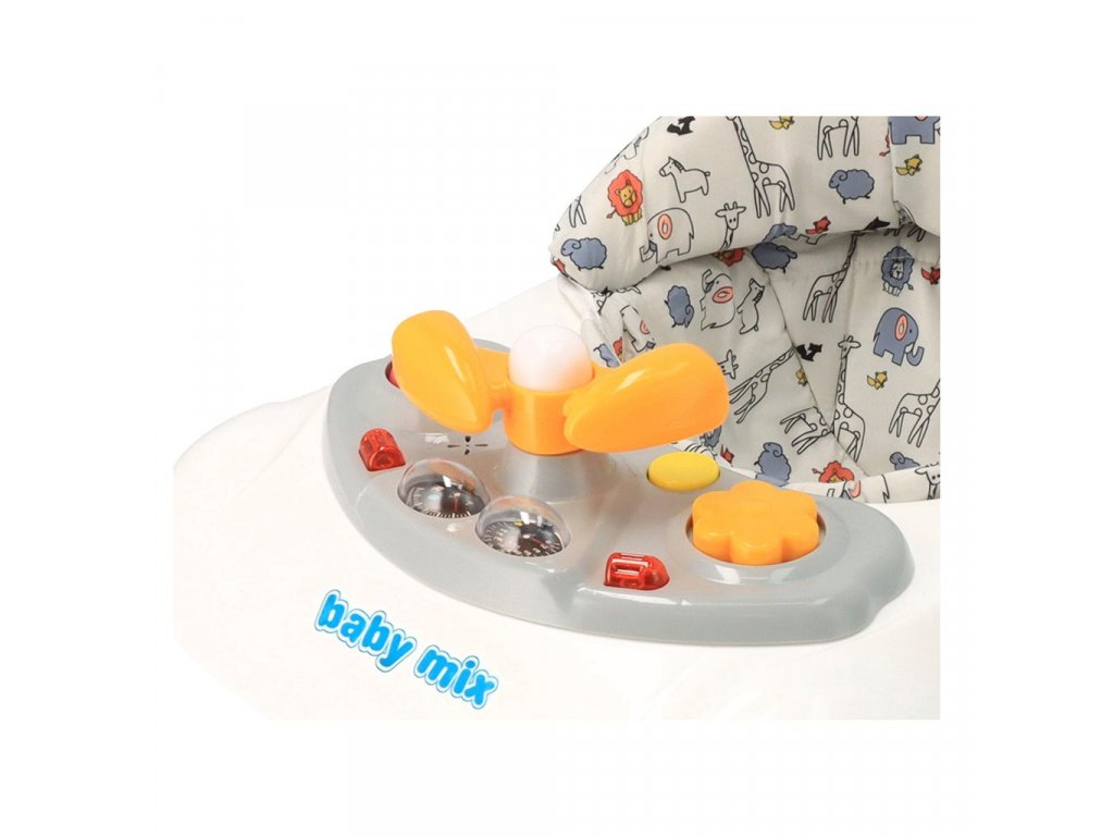 Multimediální chodítko Baby Mix se silikonovými kolečky. Chodítko je vybaveno pohodlným ergonomicky tvarovaným sedadlem, které zajišťuje správné držení páteře. Multimediální panel obsahuje různé světelné efekty, troubící volant, kterým lze otáčet, tlačítka pro přehrávání melodií a dvě světla. Krásné chodítko s hračkami okouzlí malé objevitele a umožní jim hrát si ještě déle. Chodítko je vybaveno speciálním systémem proti převrácení, který zajistí Vašemu dítěti pohodlí a bezpečnost.