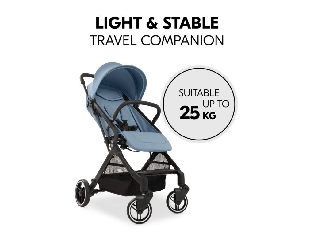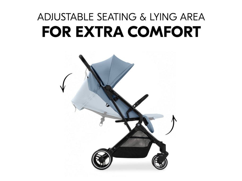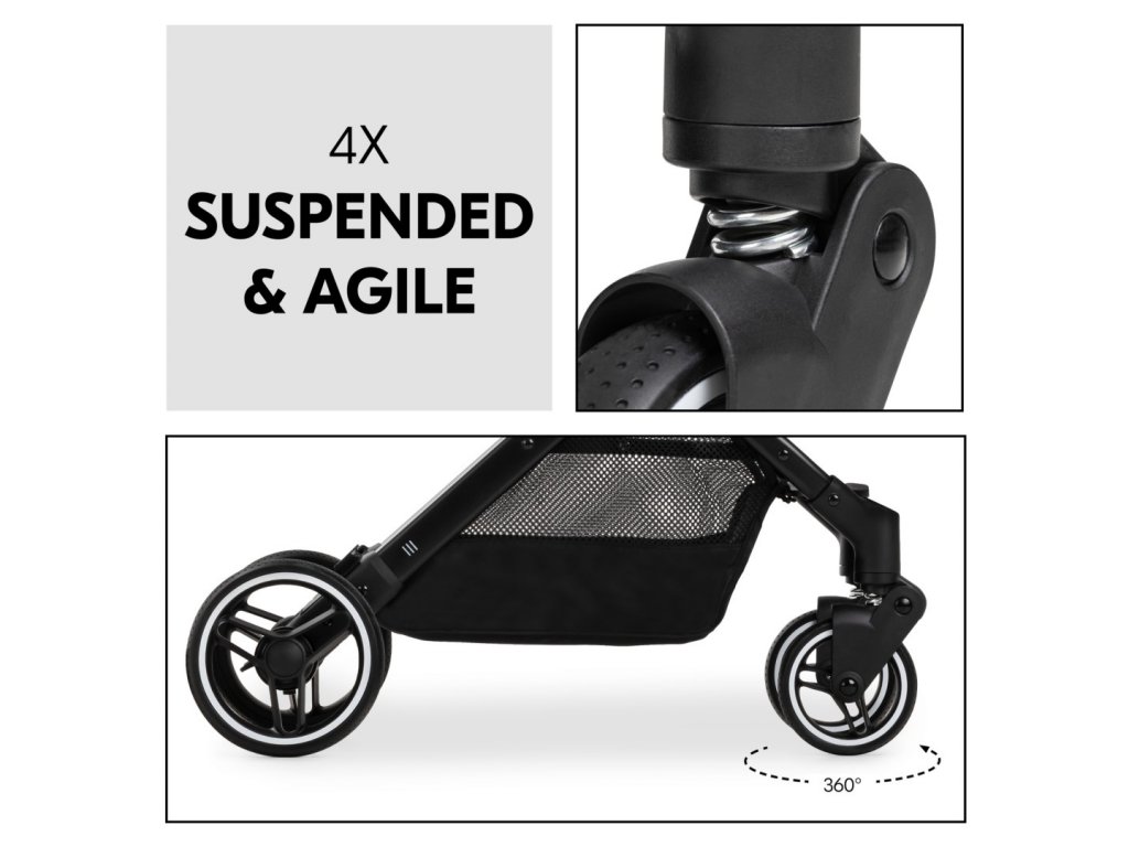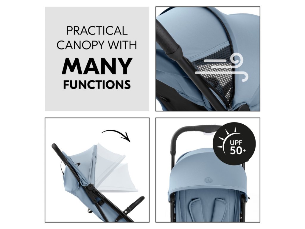 Díky odpružení tlumícímu nárazy a kolečkům pro hladkou jízdu odolným proti propíchnutí si vaše dítě užije pohodlnou jízdu. Rychlé manévrování nákupním centrem je díky otočným kolečkům hračkou. Když chce vaše dítě spát, můžete jednoduše sklopit opěrku zad jednou rukou. Sluneční stříška s UV ochranou 50+ nabízí příjemný stín, zatímco síťovaná okénka poskytují dostatečnou cirkulaci vzduchu.