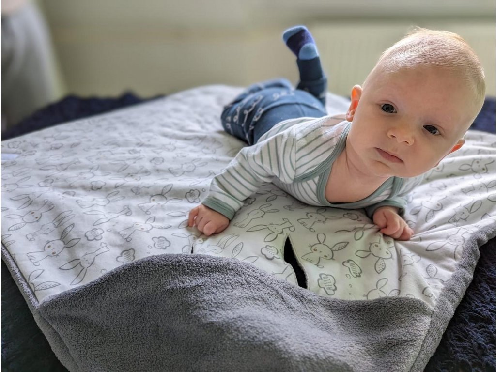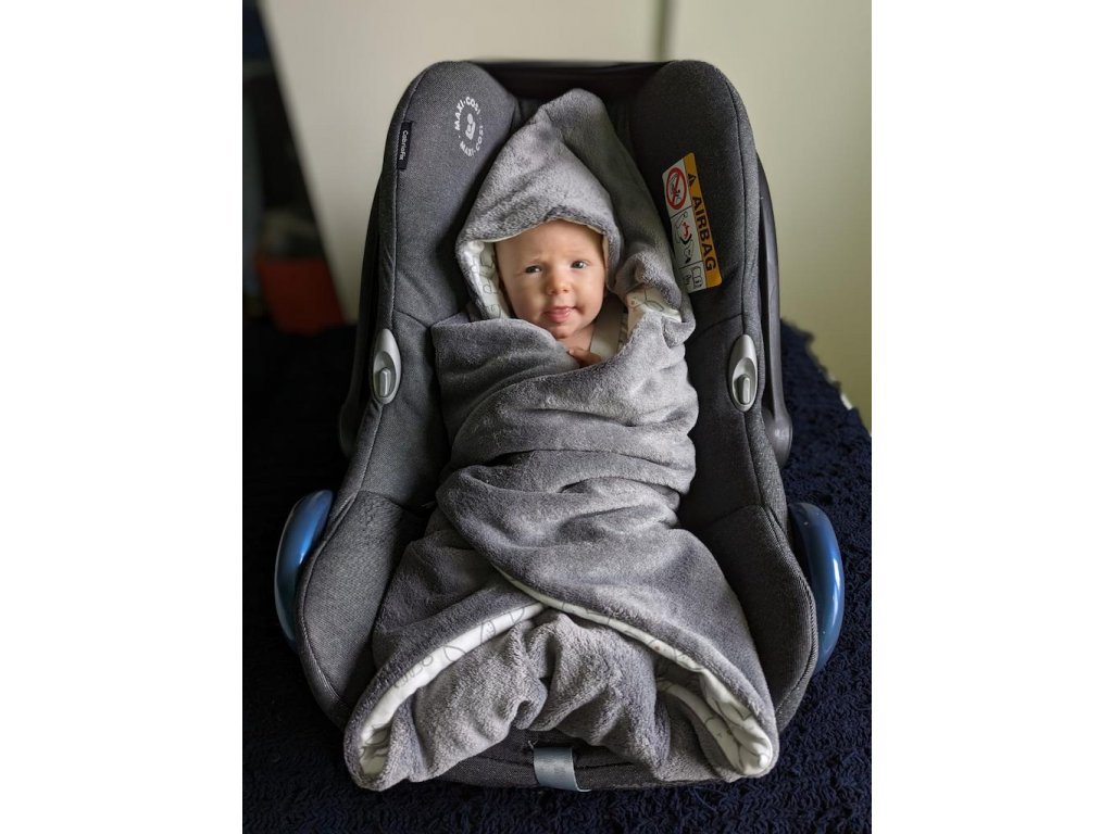 Šedá zateplená zavinovačka má vrchní stranu z wellsoftu, podšívku ze 100% bavlny a uvnitř je vyplněná vatelínem. Zavinovačka má použití od podzimu do jara, lze jí použít do autosedačky s tříbodovým zapínáním. Rozměr zavinovačky je cca 75 x 75 cm, může se prát v pračce na 30 °C. Zavinovačka se zapíná na suchý zip a má i praktickou kapuci. Vyrobeno v ČR.