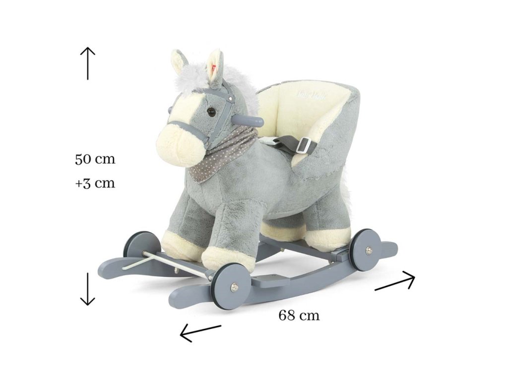 Měkoučký houpací koník Polly byl navržen pro nejmladší děti, pro které jsou tradiční houpací koně příliš velké. Pohodlné a tvarované sedadlo ve tvaru křesla a nastavitelné popruhy poskytují pohodlí a bezpečnost během bezstarostného houpání vašeho dítěte. Opěrky pro nohy na lištách a rukojeti ještě více pomáhají udržet rovnováhu. Překlopením jednoduchého mechanismu na lištách vysunete kolečka, čímž ve vteřině změníte houpací hračku v jezdícího koníka. Houpací lišty lze jednoduše odšroubovat. Po stisknutí ouška koník vesele zařechtá, po stisknutí druhého vydá zvuk klusajícího koně. Baterie se vkládají do pouzdra umístěného na bříšku.