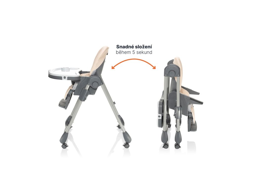 Jídelní židličku Monti 2 lze snadno složit a díky jejím kompaktním rozměrům ve složeném stavu nebude zabírat mnoho místa. Navíc je vybavena kolečky s brzdou pro snadnou manipulaci a přemísťování. Pro snadnou manipulaci lze pultík zavěsit na židličku, a tak nebude nikde zavazet, když zrovna nebude používán.