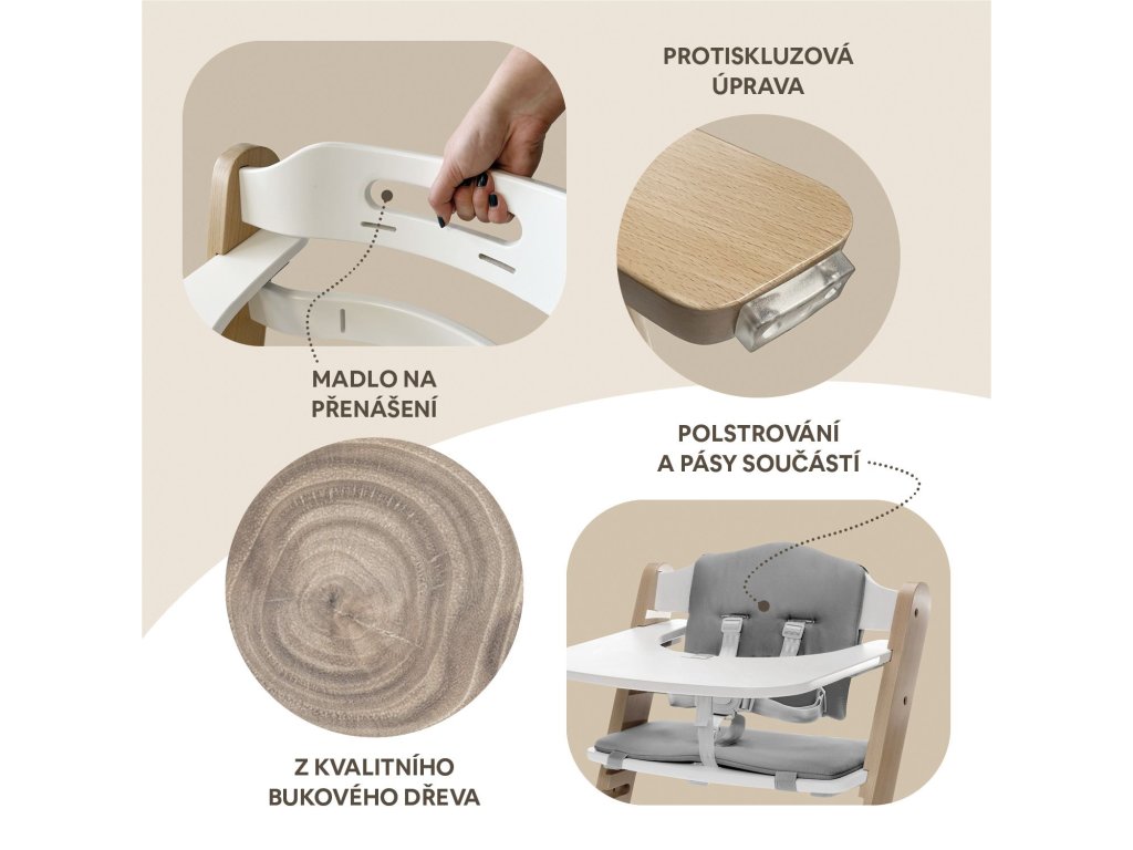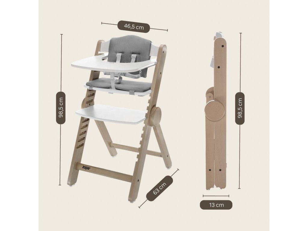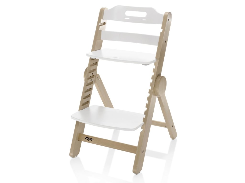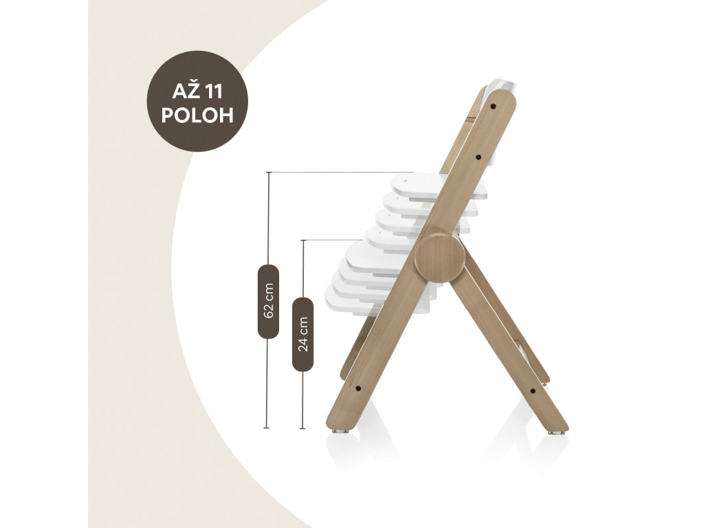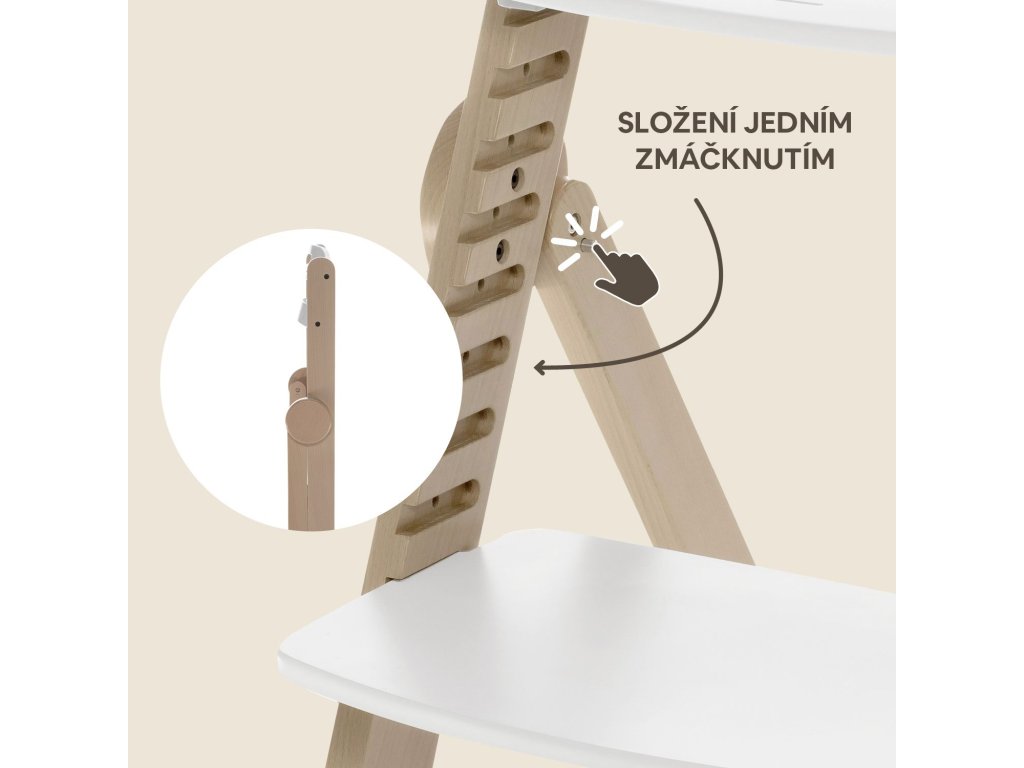 Díky inovativnímu systému Clipp & Clapp lze židličku jednoduše přizpůsobit výšce bez potřeby nářadí. Jako jedna z mála dřevěných židliček na trhu lze složit, což díky kompaktním rozměrům po složení umožní snadné skladování a madlo zase usnadní přenášení židličky.