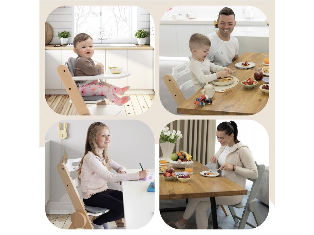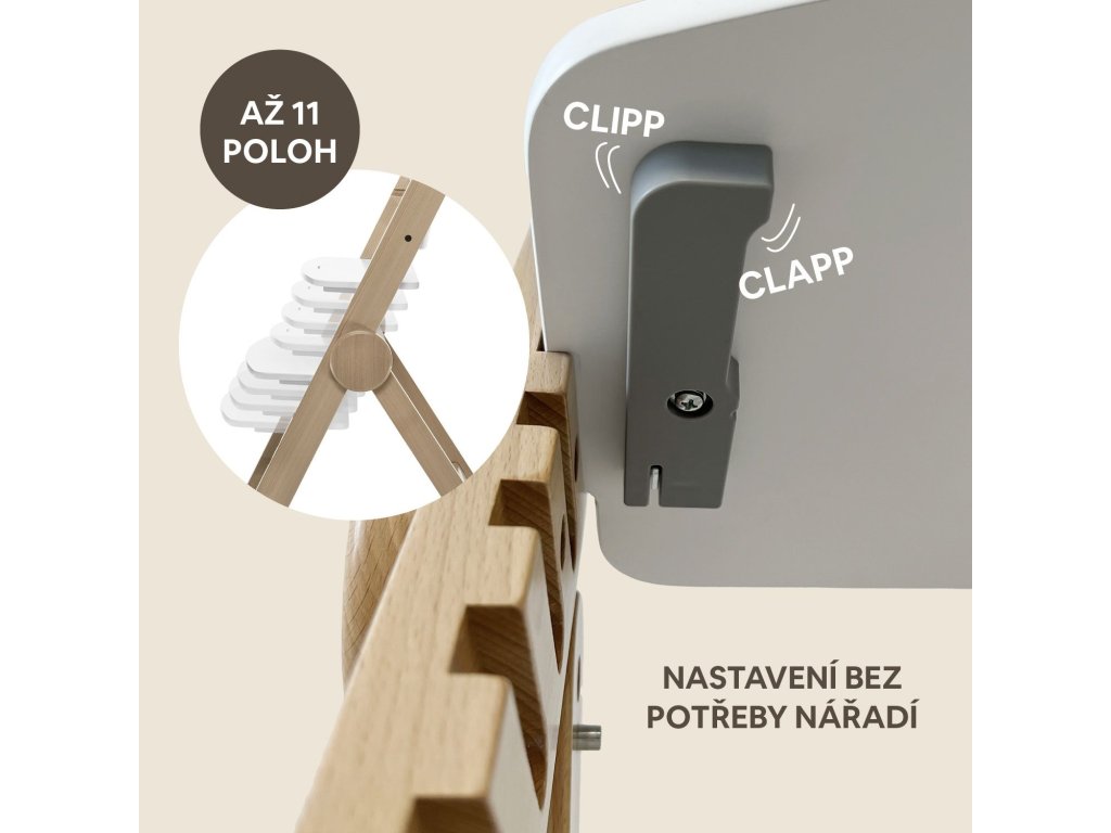 Revoluční dětská jídelní židlička "Clipp & Clapp", je designována pro dlouhodobé používání od prvních lžiček až do dospělosti s důrazem na vždy dokonale ergonomickou polohu, která podporuje zdravé držení těla při sezení a tím zdravý vývoj páteře dítěte. Židlička nabízí možnost výškově nastavit sedátko a podnožku a tím se dokonale přizpůsobí malému batoleti, které ochutnává svůj první příkrm, školákovi na cestě za poznáním při vypracovávání domácích úkolů, ale i dědečkovi, který mu s nimi pomáhá. Tato židlička je vyrobená z masivního bukového dřeva, nabízí výjimečnou odolnost a nosnost testovanou až na 110 kg, takže spolehlivě unese i dospělou osobu.