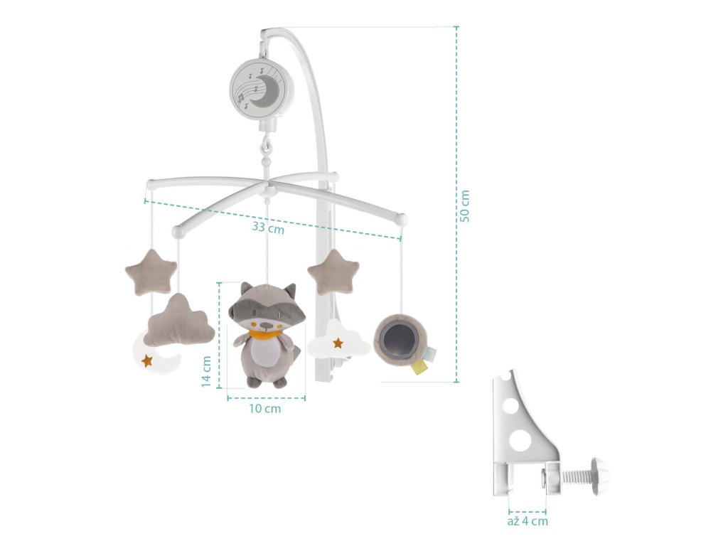 Kolotoč je navržen pro standardní postýlky a jeho montáž je velmi snadná. Natahovací hudební strojek pracuje bez baterií. Jemné plyšové hračky z kvalitního, nezávadného materiálu, velmi příjemného na dotek, se z kolotoče dají lehce odpojit a mohou se stát také malými mazlícími kamarády.
