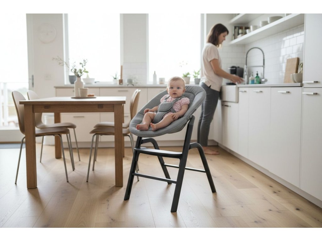 Novorozenecký set je určen pro miminka od narození do 9 kg. Nabízí pohodlnou a bezpečnou polohu s možností nastavení sklonu zádové opěrky, měkkým, prodyšným polstrováním a pětibodovým bezpečnostním pásem. Díky výšce židličky je dítě zapojeno do dění u stolu už od prvních dnů.